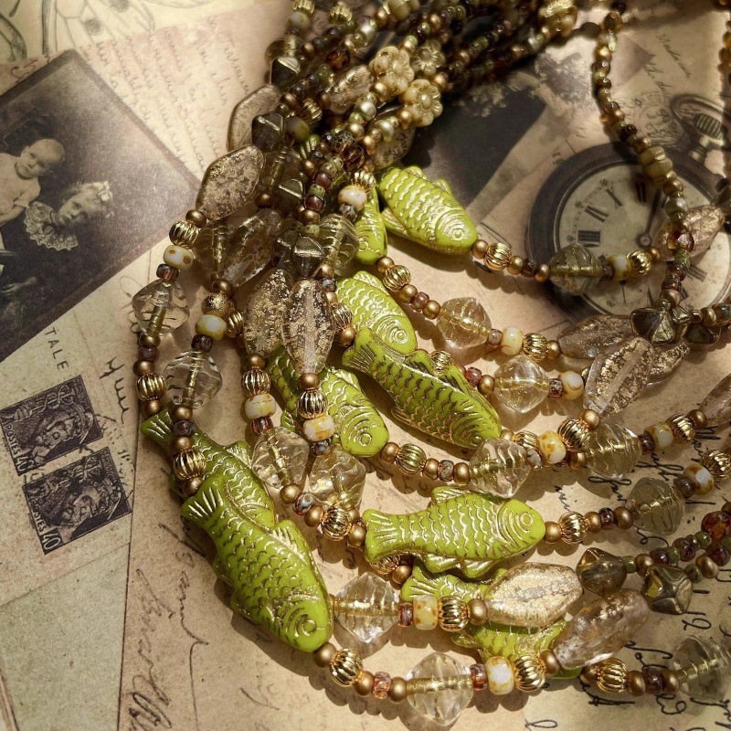 Original design beaded vintage green koi Czech bead necklace